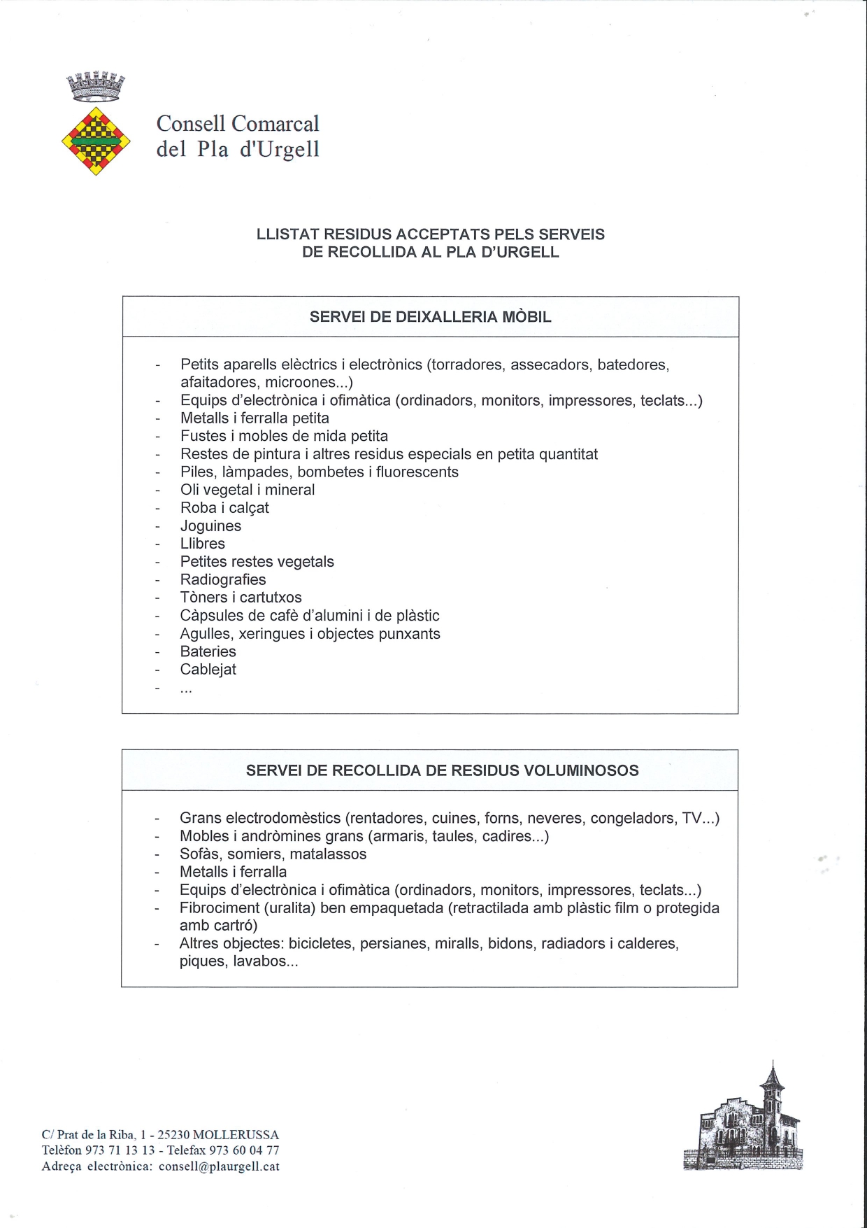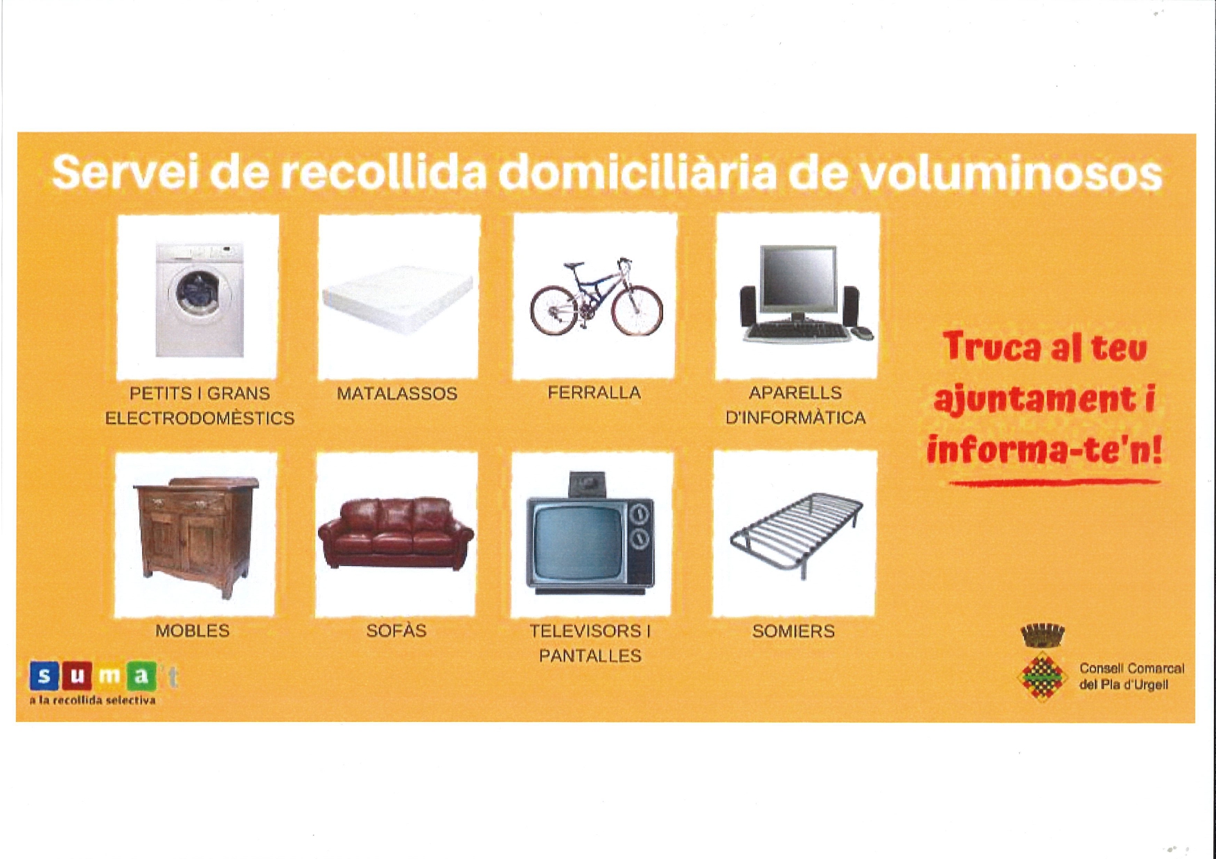 L’Ajuntament informa que el pròxim dijous dia 29 es farà la recollida de voluminosos. S’ha de comunicar la llista dels objectes a recollir al telèfon 973324000 o per correu electrònic a ajuntament@vilanovabellpuig.ddl.net. L’últim dia per comunicar els objectes és divendres dia 23 a les 12.